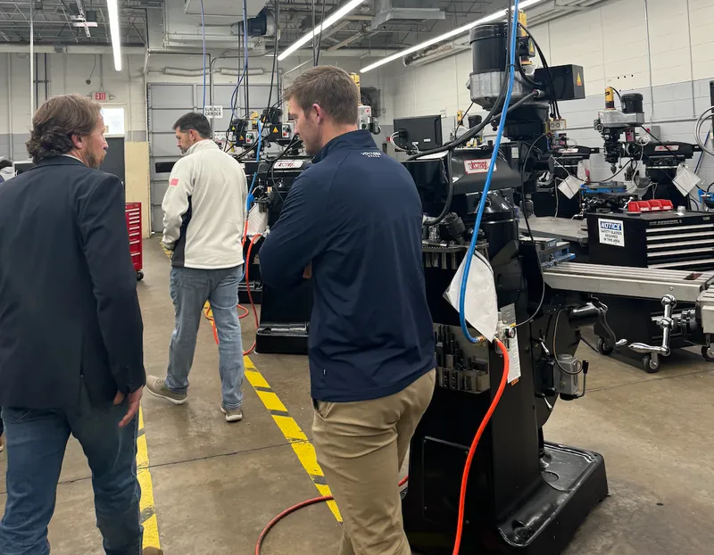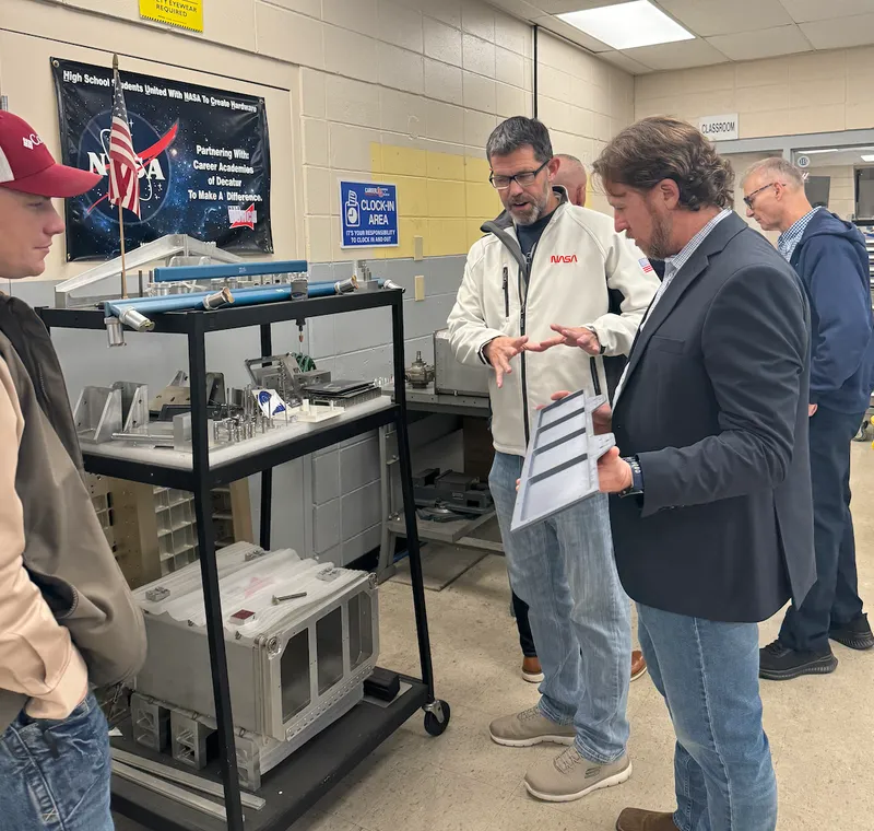 NASA HUNCH Program Manager Scott Rodriguez, HUNCH Program Director George Kessler, along with Bill Gibson, Mike Lewis, and Robbie Harris from Voyager Space, recently visited The Career Academies of Decatur in Decatur, Alabama, to connect with students and educators shaping the future of manufacturing and engineering technology. The visit highlighted the school’s specialized programs, particularly the Precision Machining Academy, where students gain hands-on experience in blueprint reading, safety, CNC programming, and the use of precision measuring tools—essential skills for careers in advanced manufacturing.