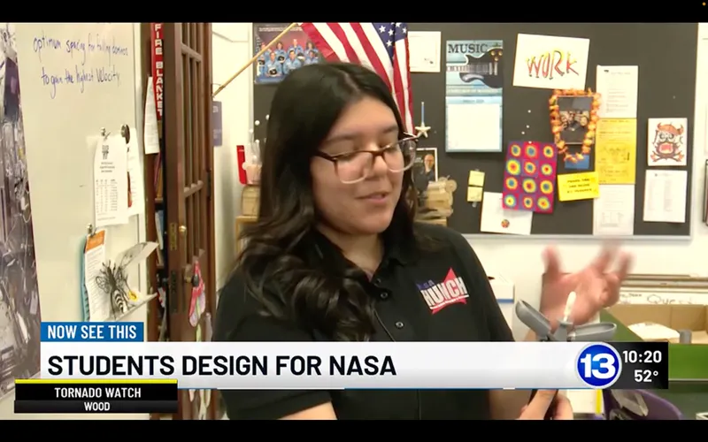 The students researched, designed, and 3D printed a prototype for a cosmic dust collector. The device will allow astronauts to collect samples in space for research. Diaz-Sanchez and Irwin had to factor in the conditions of space, like zero gravity, in their design. Their team caught the attention of NASA, who selected their product as one of the finalists from across the country. Next week, Diaz-Sanchez and Irwin will go to the Johnson Space Center in Houston to show their prototypes to astronauts and engineers.